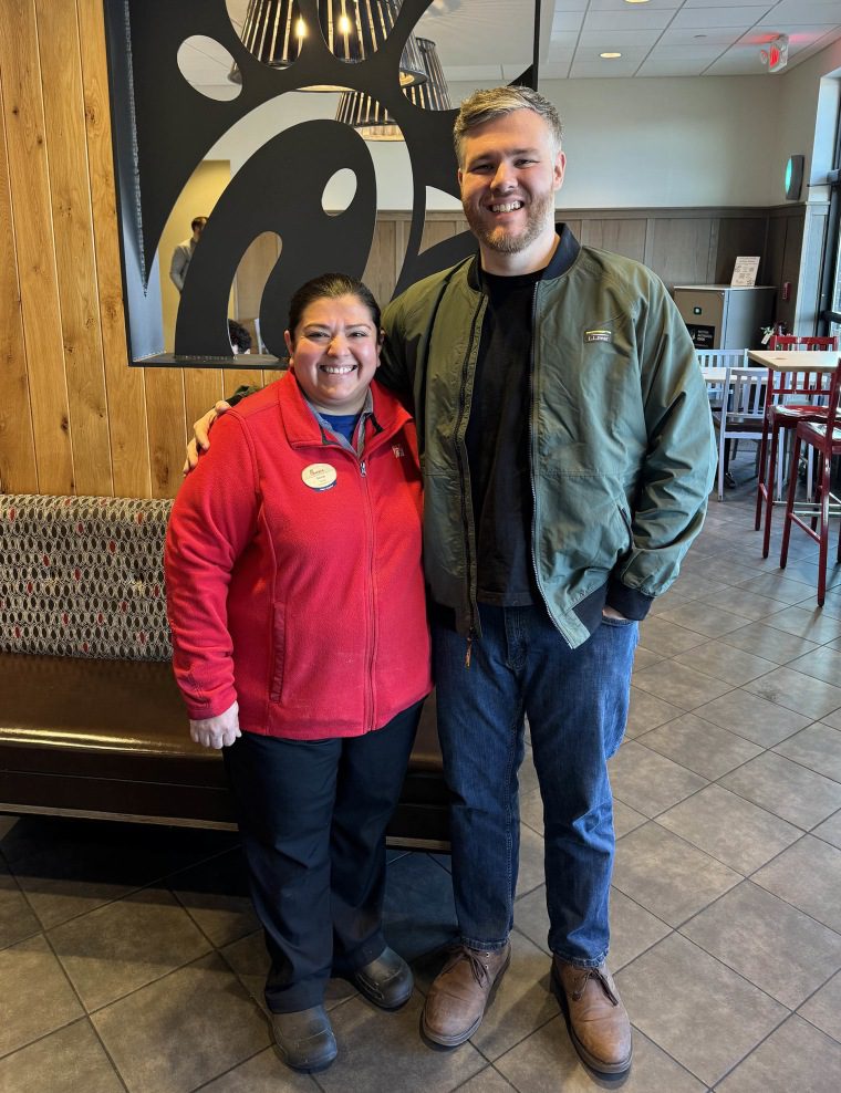 Кэрролл позирует с Сильвией, сотрудницей его офиса в Чик-фил-А. Он говорит, что персонал ресторана стал для него системой поддержки, когда он приходил каждый день, чтобы заказать салат.Предоставлено Томом Кэрроллом